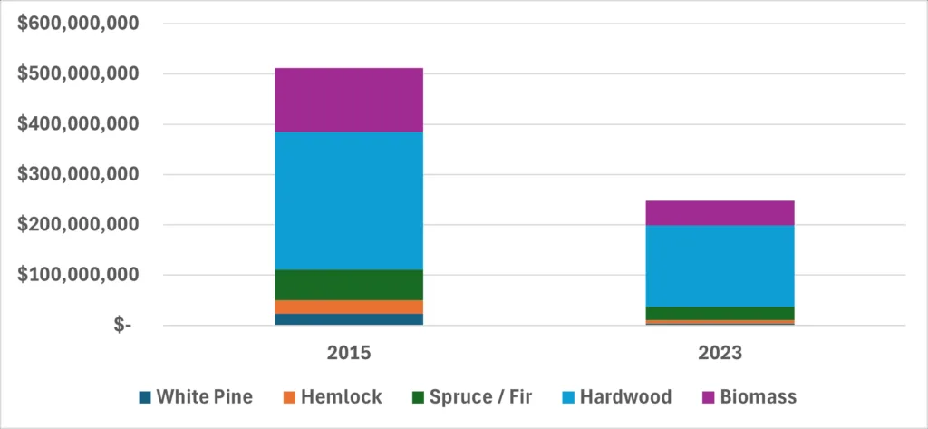After losing these markets, statewide timber harvest fell from 13 million green tons in 2015 to about 8.6 million in 2023. Using the average delivered price ($ per green ton) for each year, the value of purchases of pulpwood and biomass from Maine timberland dropped from $512 million in 2015 (2023 dollars) to $248 million in 2023. This is the result of a significant loss of demand, coupled with a decrease in the inflation-adjusted per-ton price of every product (likely a result of reduced demand). This $264 million loss has been felt by Maine landowners, loggers, and truckers.