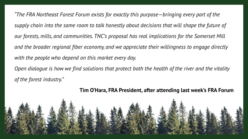 TNC is sensitive to this issue and attended the FRA Forest Forum to present its plan directly to the forest industry supply chain. They emphasized that they have a “100% commitment to develop a plan with SAPPI to ensure the Somerset Mill’s water system needs are fully addressed as part of any long-term river restoration plan. A solution that addresses the mill’s needs and provides safe, timely, and effective passage for sea-run fish like endangered Atlantic salmon is not only possible, but also necessary.” TNC and its partners clearly stated that no plan to decommission the Shawmut Dam will be advanced until a solution is identified that achieves both goals.