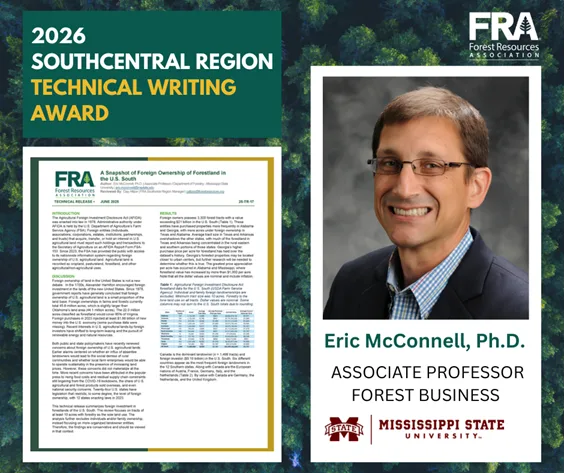 The Southwide Region Spring Meeting was approved for 6.0 Category 1 CFEs by the Society of American Foresters (3.0 for SRCOFE Meeting and 3.0 for FRA Afternoon Session). The Southeastern Region’s next meeting will be in Athens, GA, on October 27-29 (joint meeting with FRA’s Forest Products Security Group). More details regarding the Southcentral Region’s 2026 Fall Meeting will be available soon.